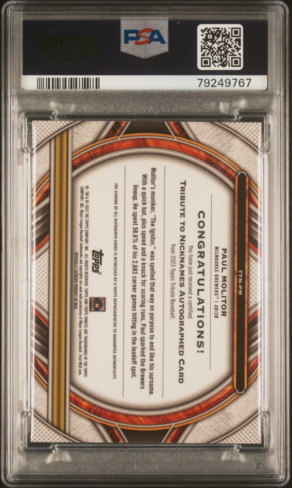 You are purchasing a 2023 Topps Tribute Tribute To Nicknames Autograph Paul Molitor #TTNPM Spectrum Autographs PSA 9 Auto 10. You will receive the exact item in the photographs. Thank you for looking.
