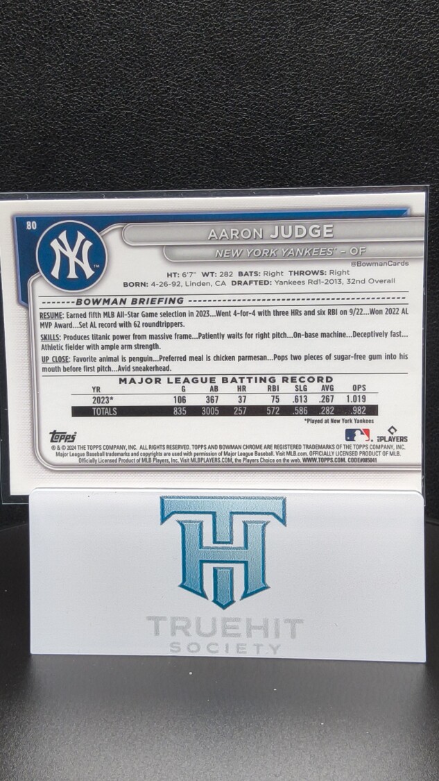 You are purchasing a 2024 Bowman Chrome Aaron Judge #80. You will receive the exact item in the photographs. Thank you for looking.