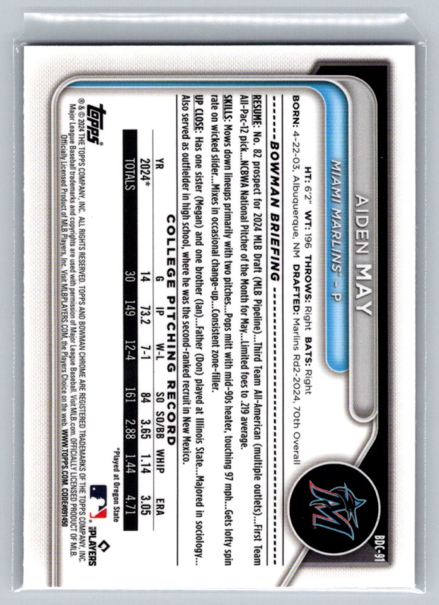 You are purchasing a 2024 Bowman Chrome Aiden May #BDC-91 Purple 237/250 Miami Marlins. You will receive the exact item in the photographs. Thank you for looking.