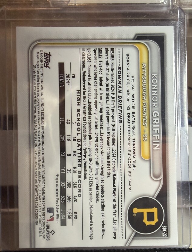 2024 Bowman Chrome Draft KONNOR GRIFFIN 1st ROOKIE CARD RC #BDC-22 - PITTSBURGH PIRATES