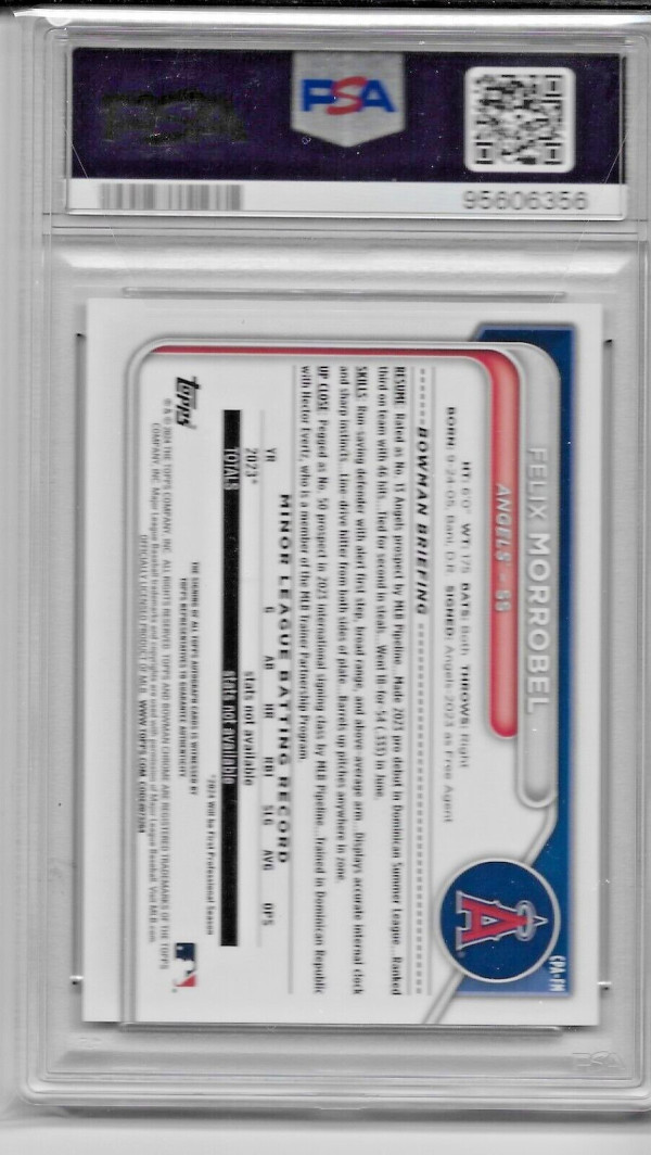 Up for sale is a 2024 Bowman Chrome Prospect Auto of Felix Morrobel. Card is graded a PSA 10 with a 9 auto.