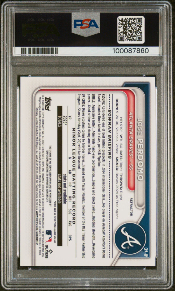 You are purchasing a 2024 Bowman Chrome Prospect Autographs Jose Perdomo #CPAJP Refractor 383/499 PSA 10. You will receive the exact item in the photographs. Thank you for looking.