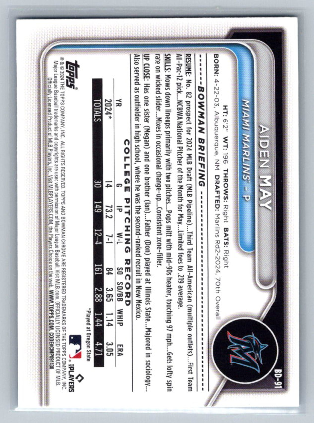 2024 Bowman Draft Aiden May #BD-91 Sky Blue 310/499 Miami Marlins