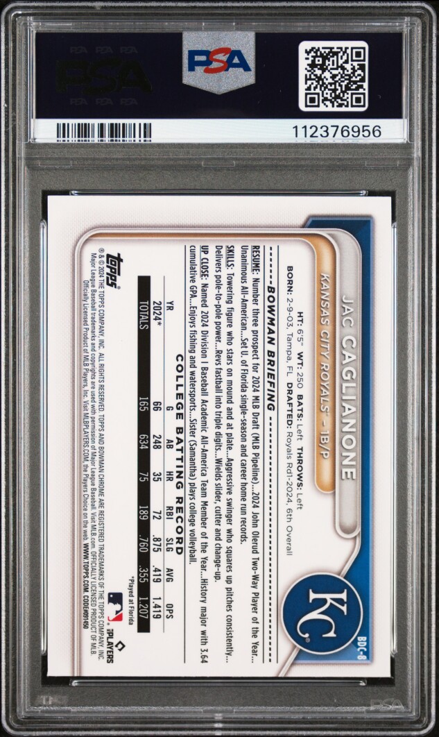 2024 Bowman Draft Jac Caglianone Chrome-Blue Refractor /150 PSA 9