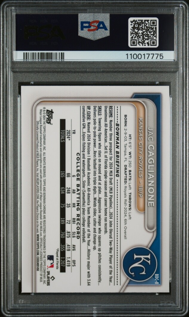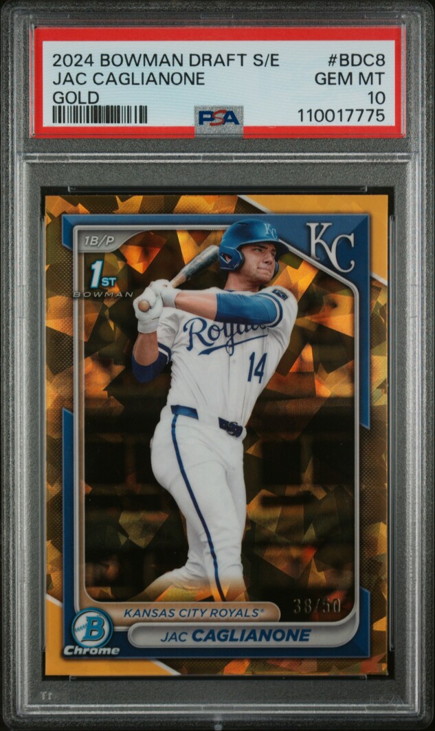 The product is a 2024 1st Bowman Chrome Draft Sapphire Gold Refractor trading card featuring Jac Caglianone of the Kansas City Royals. This original card is a PSA 10 graded standard size baseball card made of card stock. It is a short print rookie card from the 2024 Bowman set, manufactured by Bowman in the United States.