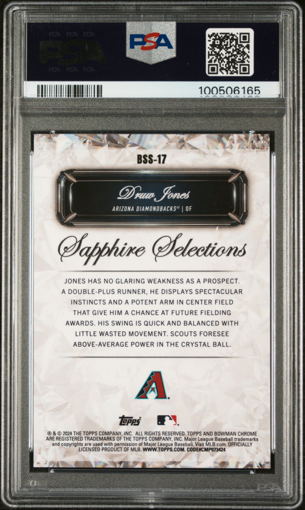 You are purchasing a 2024 Bowman Sapphire Edition Sapphire Selections Druw Jones #BSS17 Orange 11/25 PSA 10. You will receive the exact item in the photographs. Thank you for looking.
