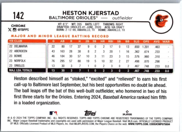 In 2024 Heston Kjerstad played for the Baltimore Orioles.