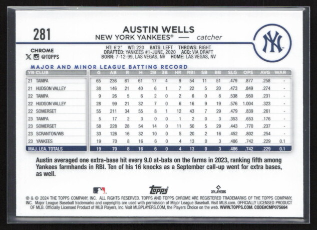 You are purchasing a 2024 Topps Chrome Austin Wells #281 X-Fractor RC. You will receive the exact item in the photographs. Thank you for looking.