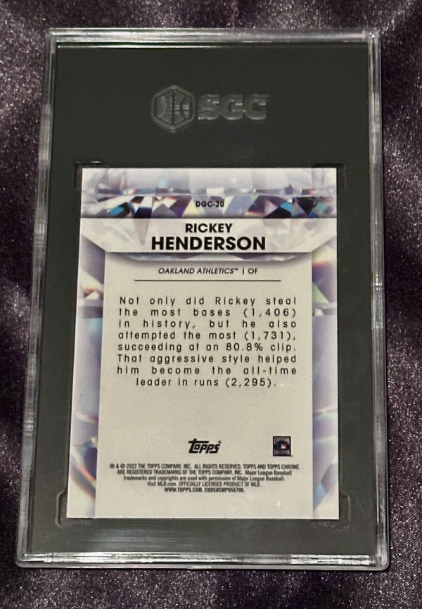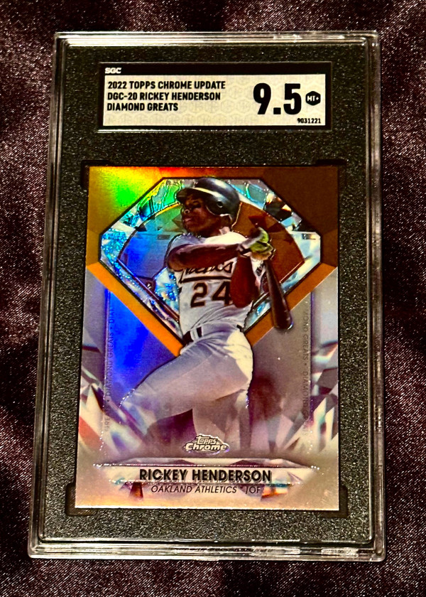 2024 Topps Chrome Update ‘Diamond Greats’ in SGC 9.5 MINT+ of the late great Rickey Henderson. Card #DGC-20.