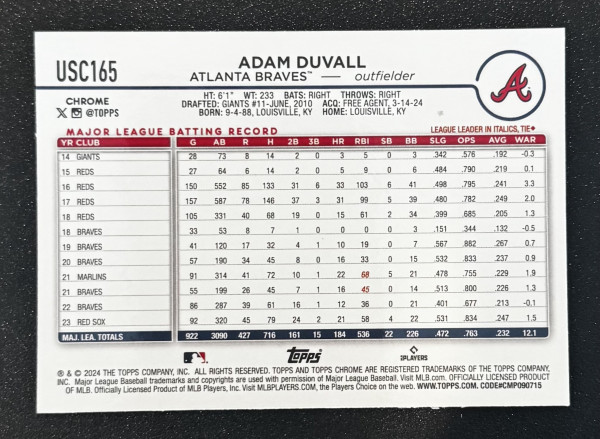 2024 Topps Chrome Update Adam Duvall #USC165 Aqua Blue Lava Lamp Refractor /175