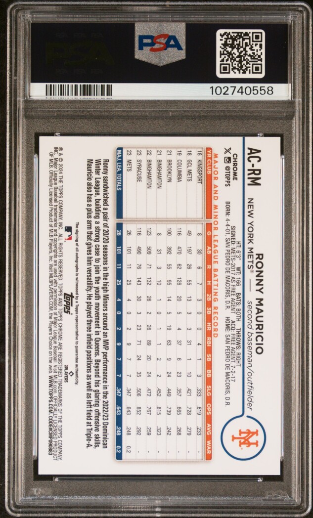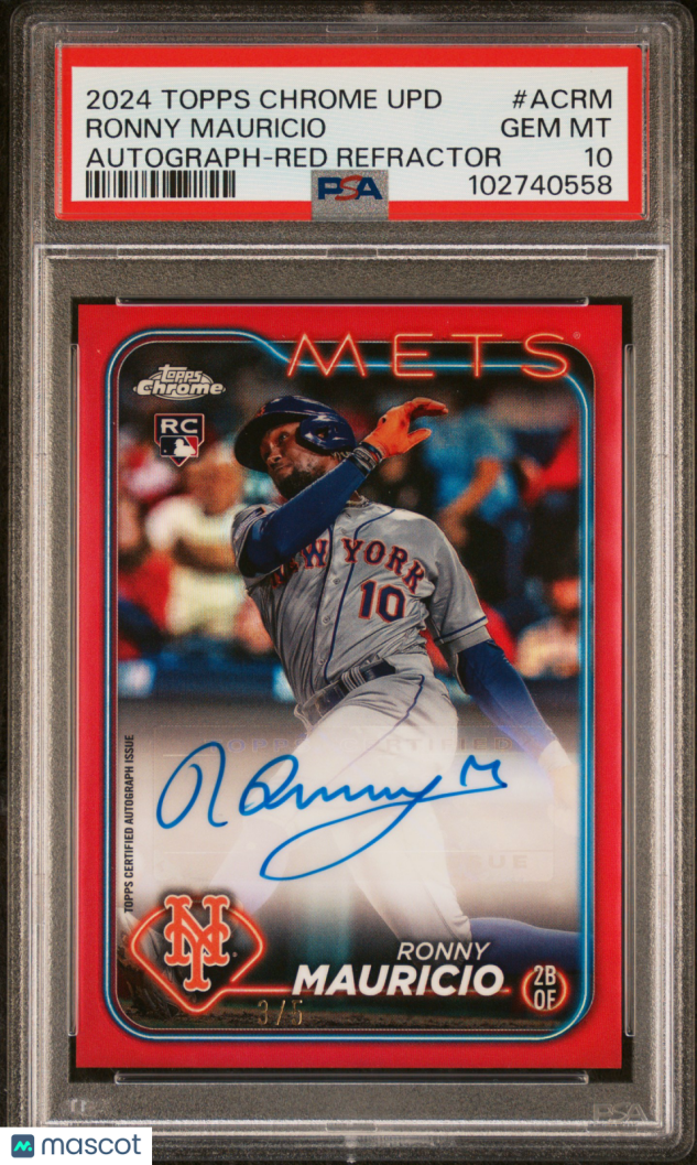 You are purchasing a 2024 Topps Chrome Update Chrome Baseball Update Series Autographs Ronny Mauricio #ACRM Red Refractor 3/5 PSA 10. You will receive the exact item in the photographs. Thank you for looking.