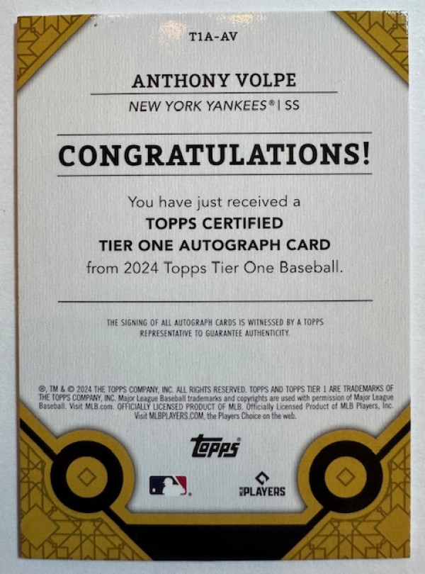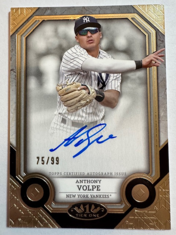 The product is a 2024 Topps Tier One Anthony Volpe autographed trading card, featuring the signature of the New York Yankees player. This limited edition card is numbered #75 out of 99, manufactured by Topps, and made of card stock material. It is an original card from the MLB World Series season of 2024, designed for baseball fans and collectors of sports trading cards. The card is authenticated by Topps and is a valuable addition to any sports memorabilia collection.