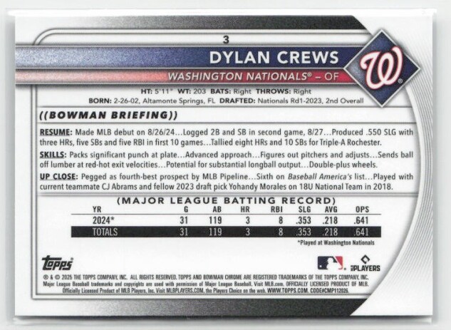 You are purchasing a 2025 Bowman Chrome Dylan Crews #3 RC. You will receive the exact item in the photographs. Thank you for looking.
