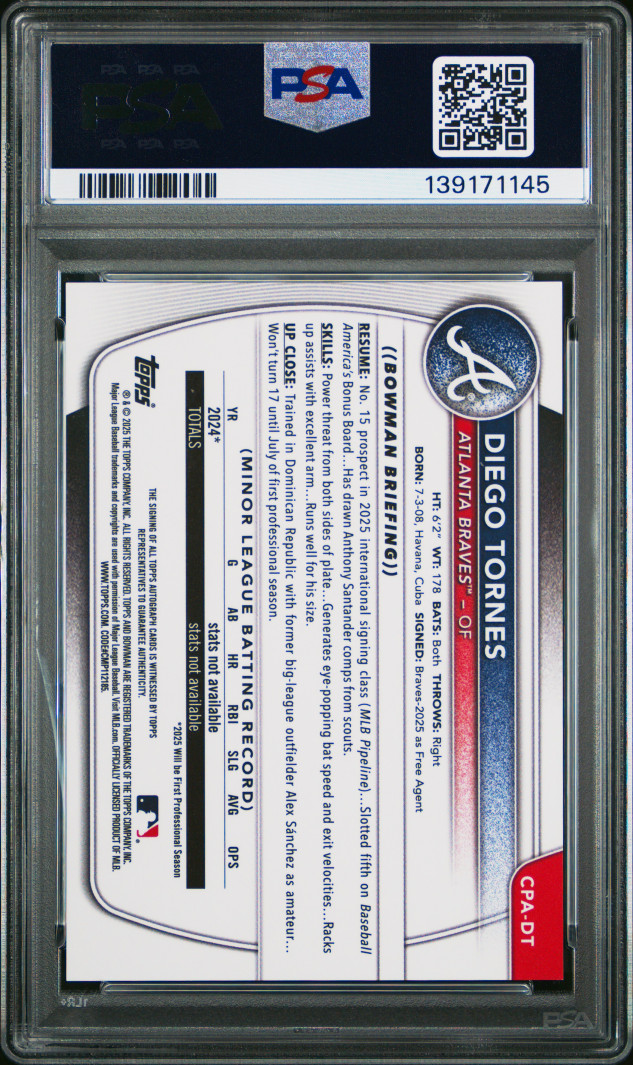 You are looking at a 2025 Bowman Chrome Chrome Prospect Autograph of Diego Tornes, card number #CPA-DT, graded PSA 10 GEM MINT the absolute highest grade possible. PSA cert #139171145. This is his 1st Bowman card, making it the most important and collectible card of his career.