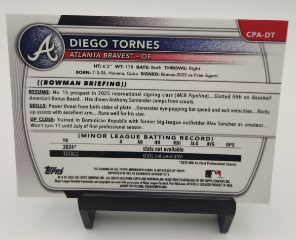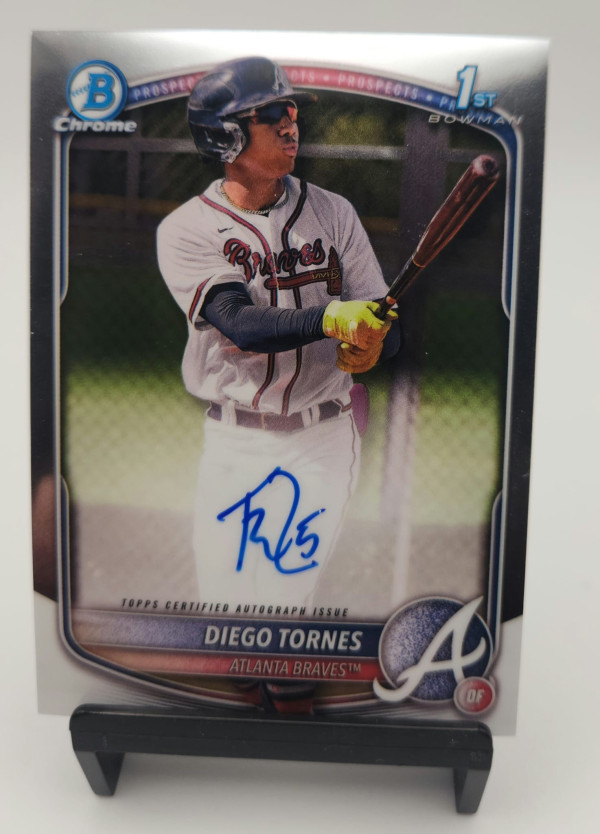 This is the 1st Bowman Chrome Certified Autograph of Diego Tornes โ€” the crown jewel of the Atlanta Braves' 2025 international signing class. Tornes ranked as MLB.com's No. 15 international prospect in the 2025 class and received a $2,497,500 signing bonus MLB โ€” the largest handed to any international player by the Braves that year. The hype is very real.