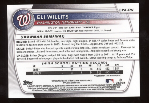 You are purchasing a 2025 Bowman Chrome Draft Prospect Autographs Eli Willits #CPA-EW 1st Bowman. You will receive the exact item in the photographs. Thank you for looking.