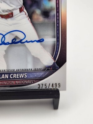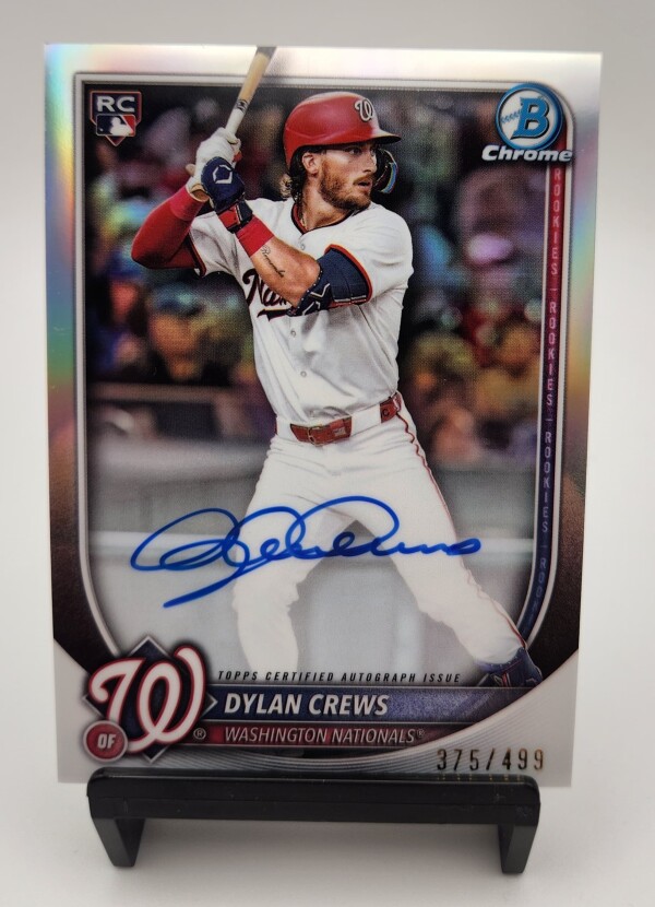Up for sale is a 2025 Bowman Chrome Dylan Crews Rookie Autograph Refractor #CRA-DC, serial numbered 375/499, featuring one of baseball’s most exciting young stars from the Washington Nationals. This card includes a beautiful on-card blue autograph, official RC logo, and sharp refractor finish that makes it stand out in any collection.