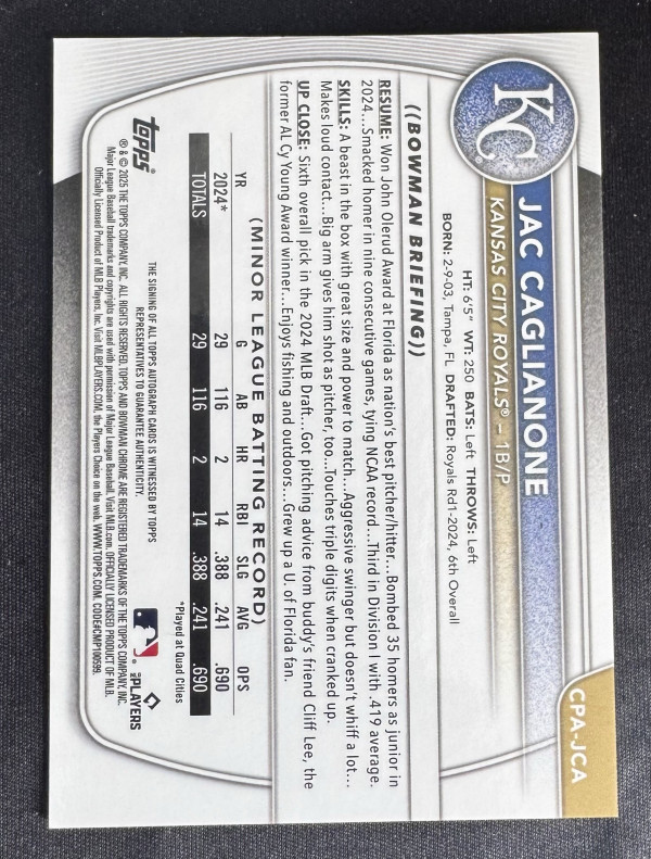 2025 BOWMAN CHROME PROSPECT AUTOGRAPHS #CPAJCA JAC CAGLIANONE
