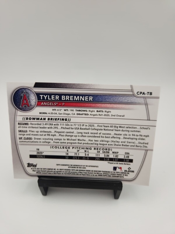 The Los Angeles Angels potentially added a future ace with the No. 2 pick in the 2025 MLB Draft, selecting UC Santa Barbara pitcher Tyler Bremner. Bleacher Report This is his 1st Bowman Chrome autograph — the most coveted rookie card format in the hobby. Get it NOW before his debut sends prices through the roof.