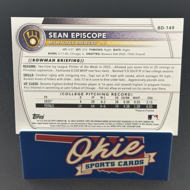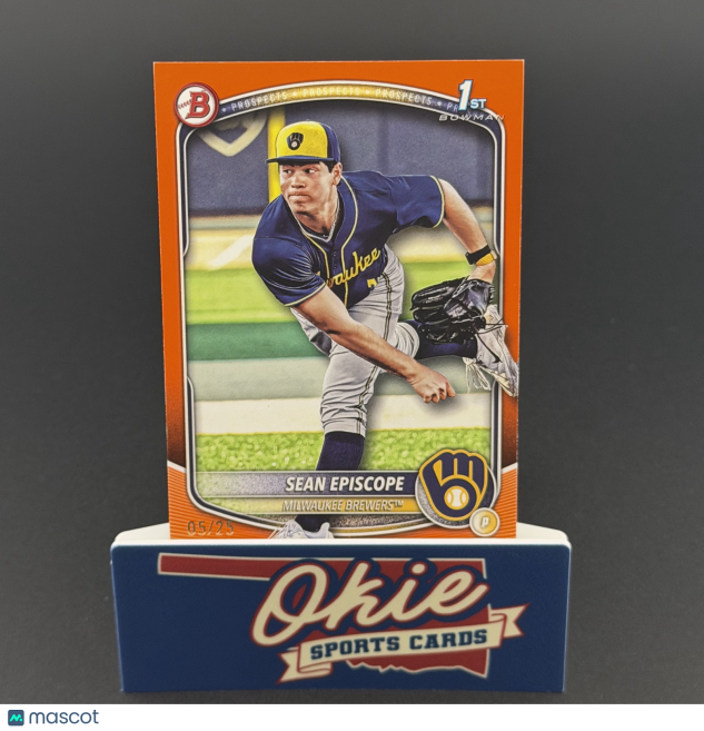 You are purchasing a 2025 Bowman Draft Sean Episcope #BD-149 Orange 05/25. You will receive the exact item in the photographs. Thank you for looking.