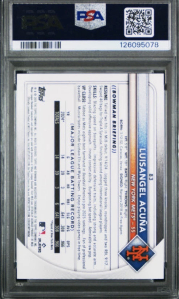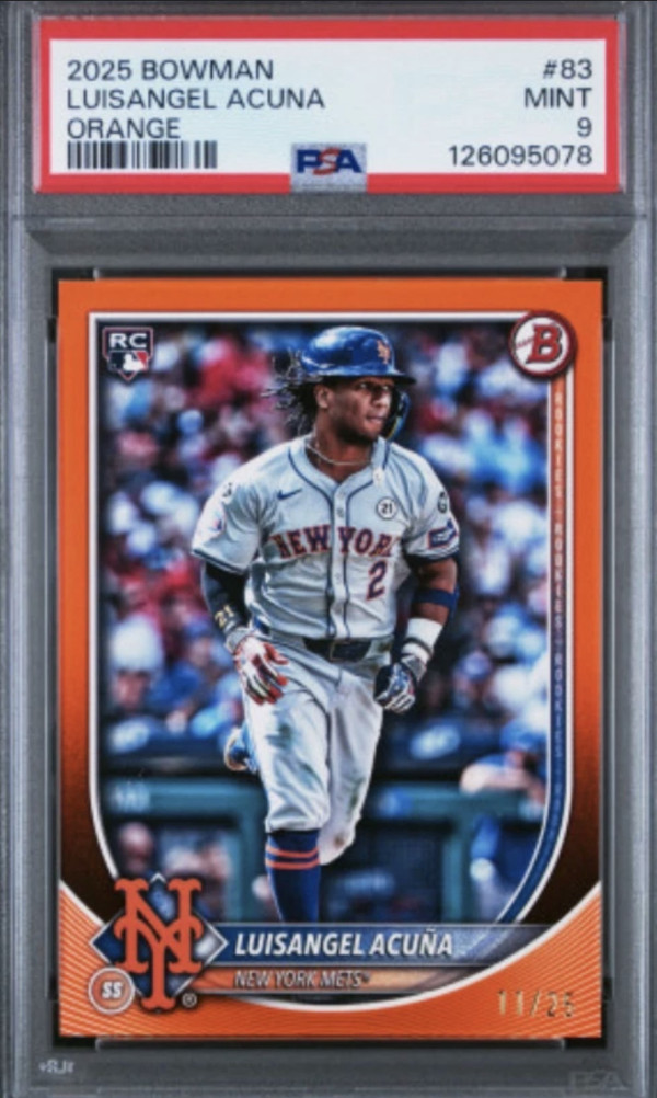 The product is a rare 2025 Bowman Luisangel Acuna Orange Paper Rookie trading card featuring the player from the New York Mets. This limited edition card is numbered #11/25 and has been graded as a PSA 9, making it a highly sought-after collectible among baseball card enthusiasts. With its origins in the MLB World Series event, this original card is part of the Rookie of the Year Favorites insert set and is a valuable addition to any sports trading card collection.