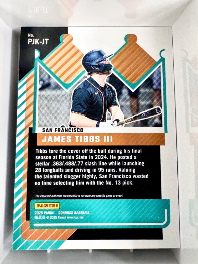 Don’t miss your chance to own this stunning 2025 Panini Donruss Jersey Kings Orange Cracked Ice card featuring James Tibbs III of the San Francisco Giants! This eye-catching MLB collectible boasts vibrant cracked ice parallels, making it a standout addition to any serious baseball card collection. Perfect for Giants fans and collectors looking to secure a rare card from the latest Donruss release.
