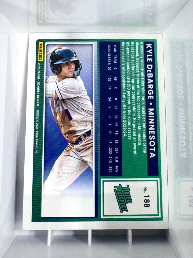 With the eye-catching Rockets parallel from Panini’s popular Donruss set, this card is perfect for display or investment. Whether you’re a dedicated Minnesota Twins supporter or a serious baseball card enthusiast, this Kyle DeBarge #188 is ready to elevate your collection. Grab it now before it’s gone!