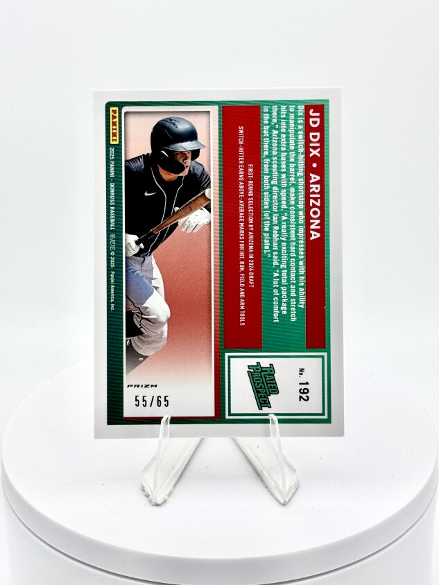 You are purchasing a 2025 Panini Donruss Optic JD Dix #192 Green Scope Prizm 55/65. You will receive the exact item in the photographs. Thank you for looking.