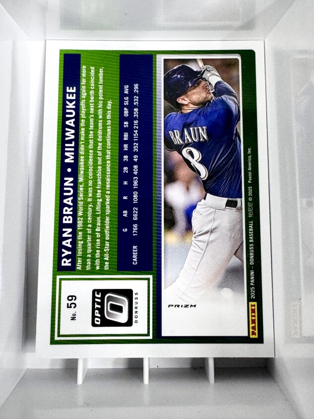 You are purchasing a 2025 Panini Donruss Ryan Braun #59 Silver Prizm. You will receive the exact item in the photographs. Thank you for looking.