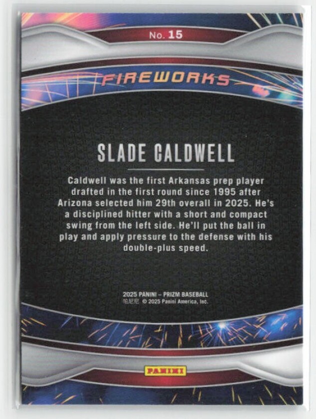 You are purchasing a 2025 Panini Prizm Slade Caldwell #15 Fireworks: Action. You will receive the exact item in the photographs. Thank you for looking.