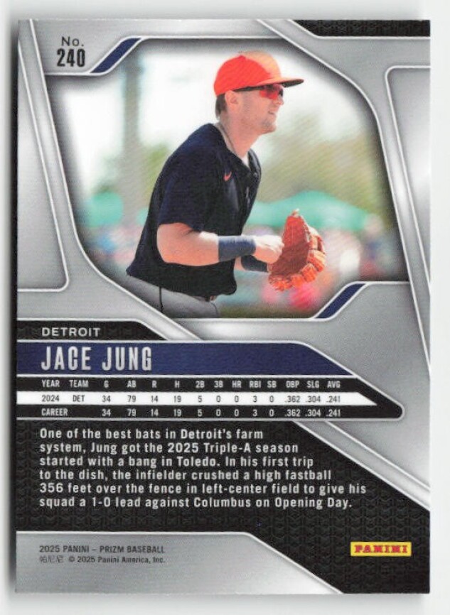 You are purchasing a 2025 Panini Prizm Jace Jung #240 RC. You will receive the exact item in the photographs. Thank you for looking.