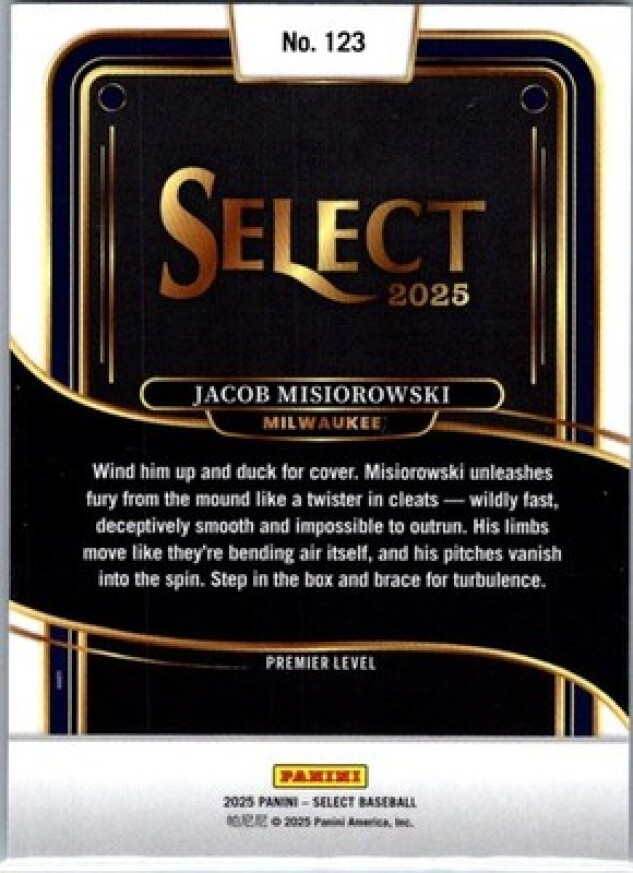 This is a nice example of a 2025 Panini Select #123 Jacob Misiorowski