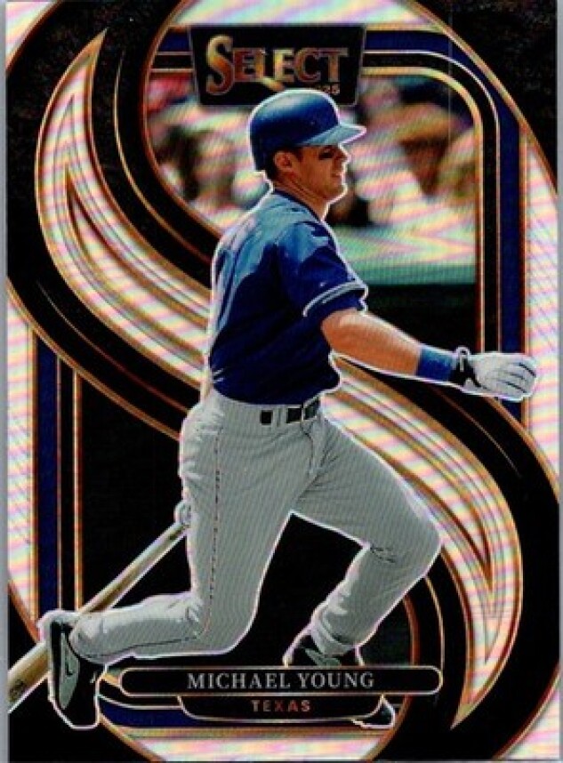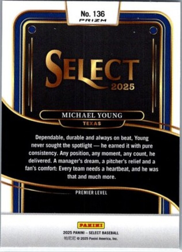 This is a nice example of a 2025 Panini Select #136 Michael Young Silver Prizms