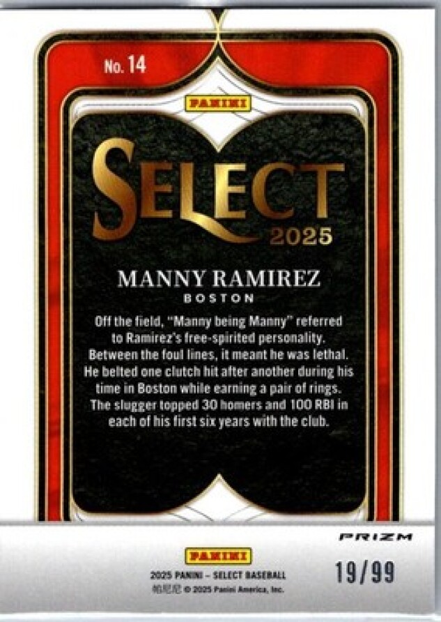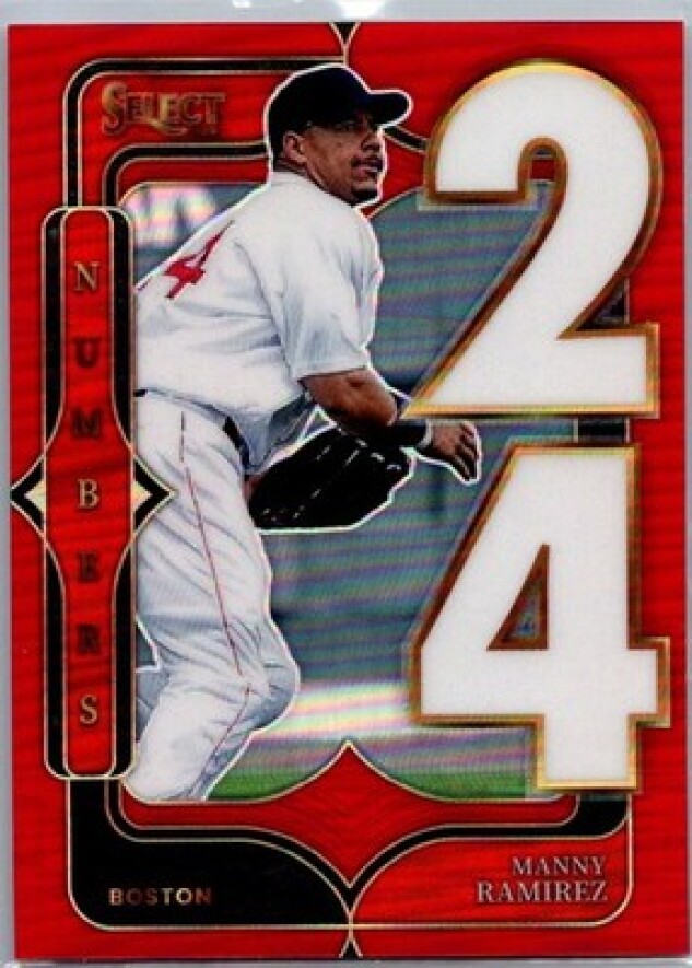 This is a nice example of a 2025 Panini Select #14 Manny Ramirez Select Numbers Red Prizm
