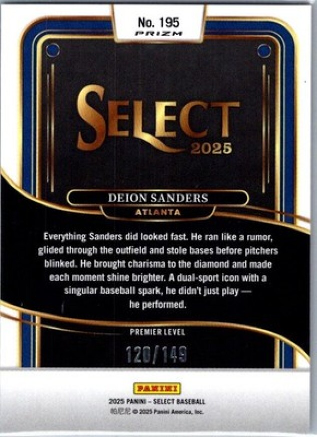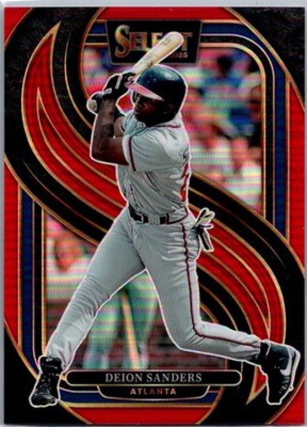 This is a nice example of a 2025 Panini Select #195 Deion Sanders Red Flash Prizms