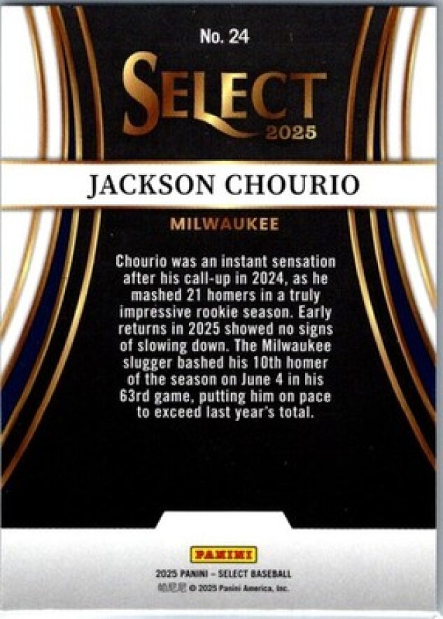 This is a nice example of a 2025 Panini Select #24 Jackson Chourio Turbo Charged