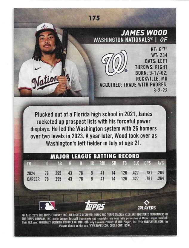 2025 TOPPS STADIUM CLUB #175 JAMES WOOD (RC)
