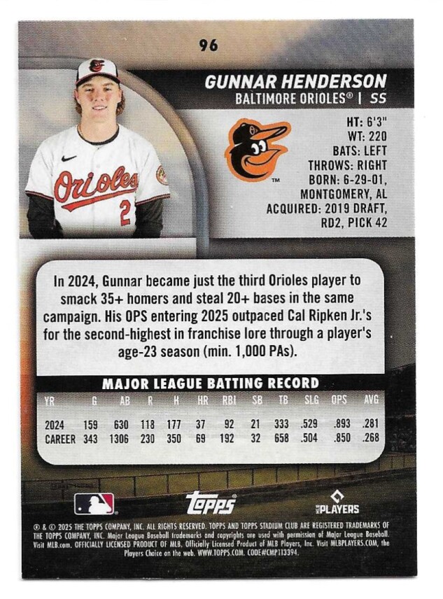 2025 TOPPS STADIUM CLUB #96 GUNNAR HENDERSON
