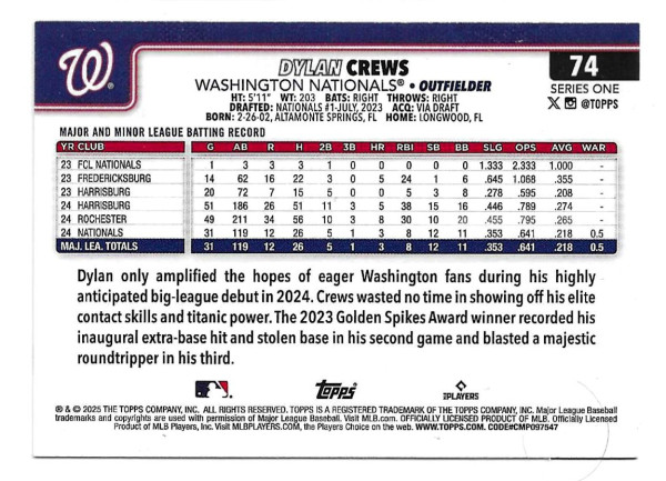 2025 TOPPS #74 DYLAN CREWS (RC)