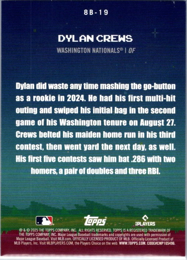 This is a nice example of a 2025 Topps #8B-19 Dylan Crews 8-Bit Ballers