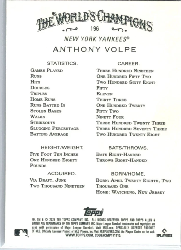 This is a nice example of a 2025 Topps Allen & Ginter #196 Anthony Volpe