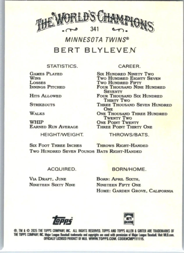 This is a nice example of a 2025 Topps Allen & Ginter #341 Bert Blyleven