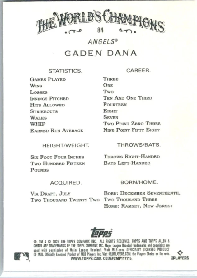 In 2025 Caden Dana played for the Los Angeles Angels.