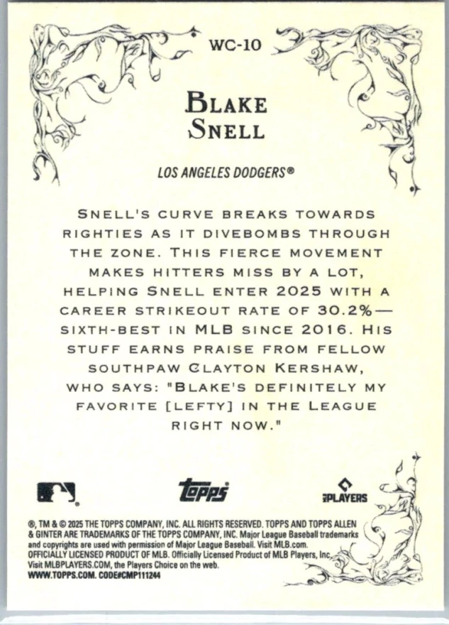 This is a nice example of a 2025 Topps Allen & Ginter #WC-10 Blake Snell Wicked Curves