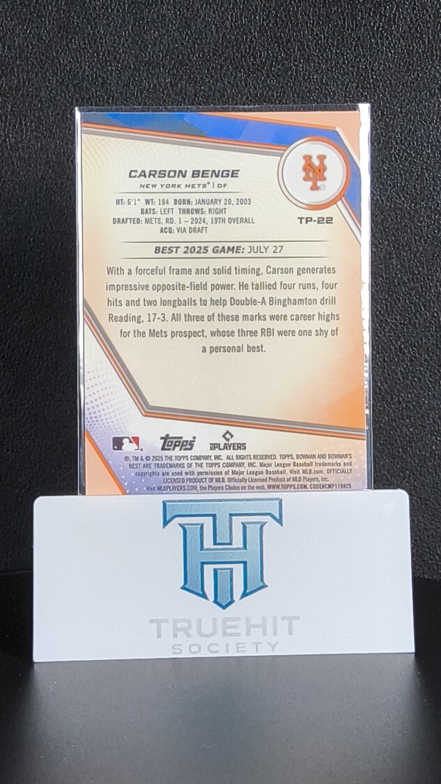 You are purchasing a 2025 Topps Bowman's Best Carson Benge #TP-22. You will receive the exact item in the photographs. Thank you for looking.