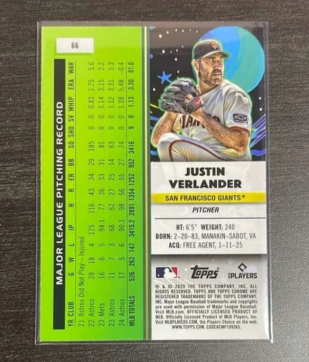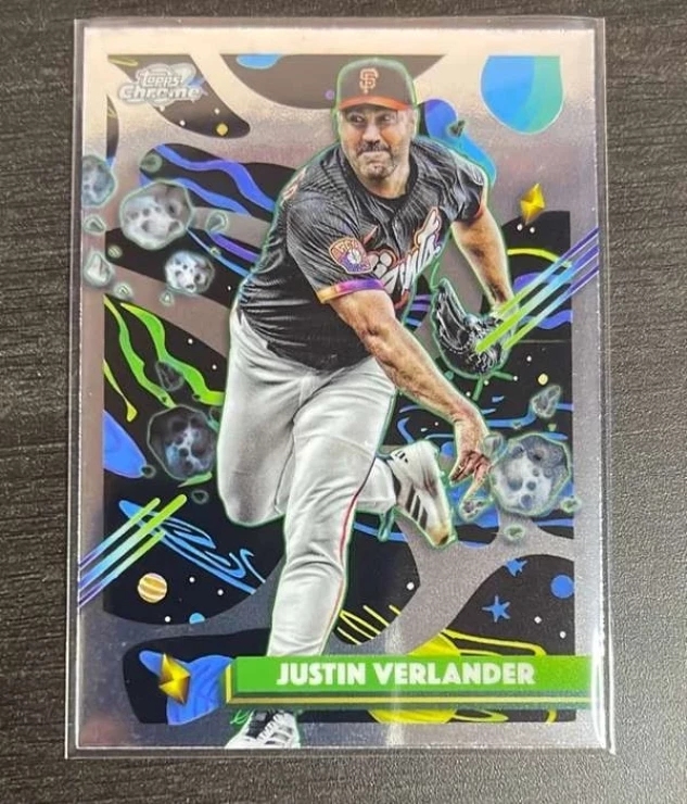 This is a nice example of a 2025 Topps Chrome Cosmic #66 Justin Verlander