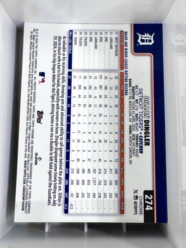 You are purchasing a 2025 Topps Chrome Dillon Dingler (RC). You will receive the exact item in the photographs. Thank you for looking.