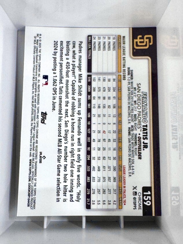 You are purchasing a 2025 Topps Chrome Fernando Tatis Jr. #159. You will receive the exact item in the photographs. Thank you for looking.