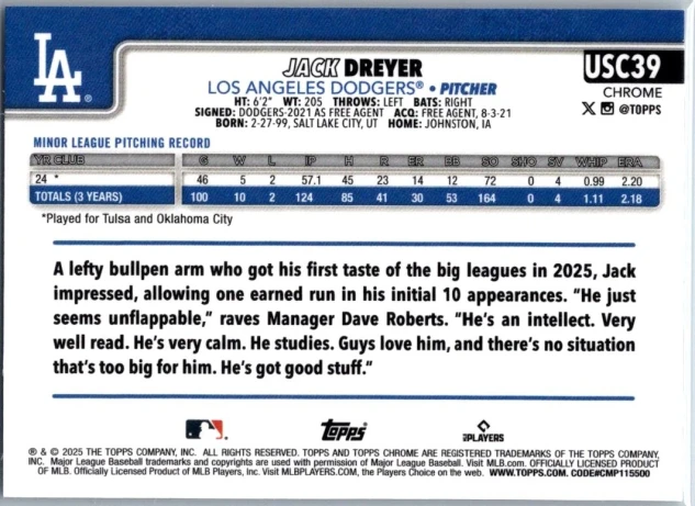 This is a nice example of a 2025 Topps Chrome Update #USC39 Jack Dreyer