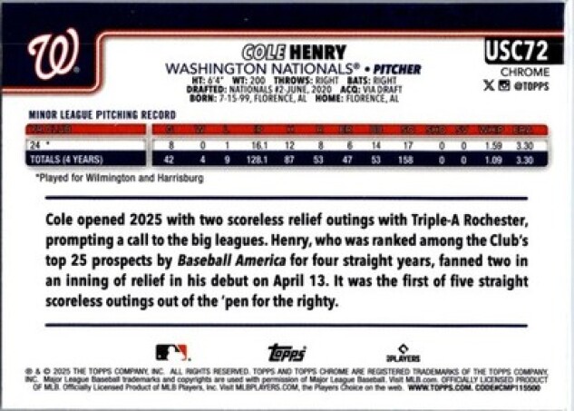 This is a nice example of a 2025 Topps Chrome Update #USC72 Cole Henry